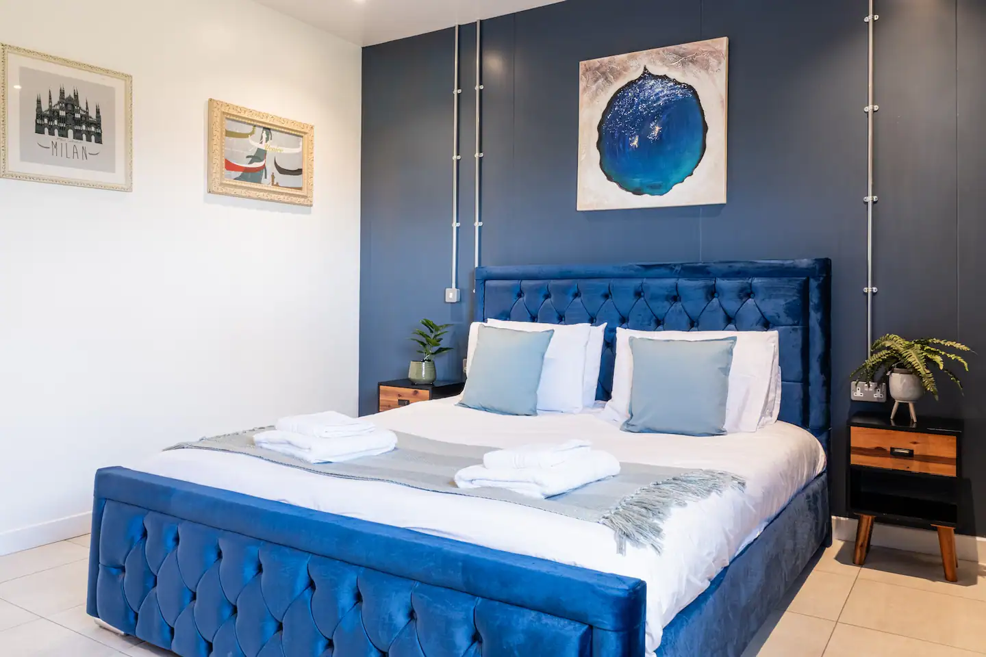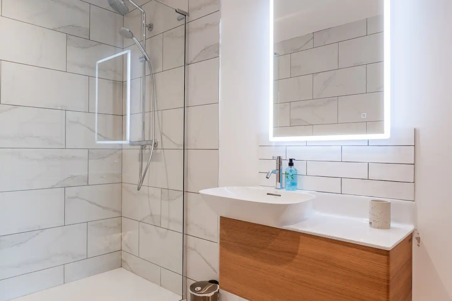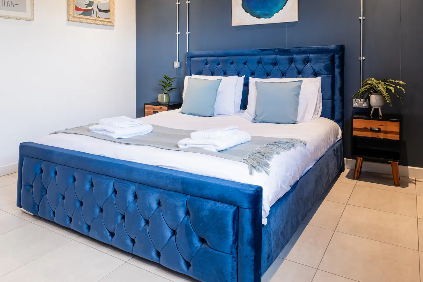 The bedroom comes complete with a super king-size bed. Next to the bedroom is a bathroom with underfloor heating and rainfall shower.